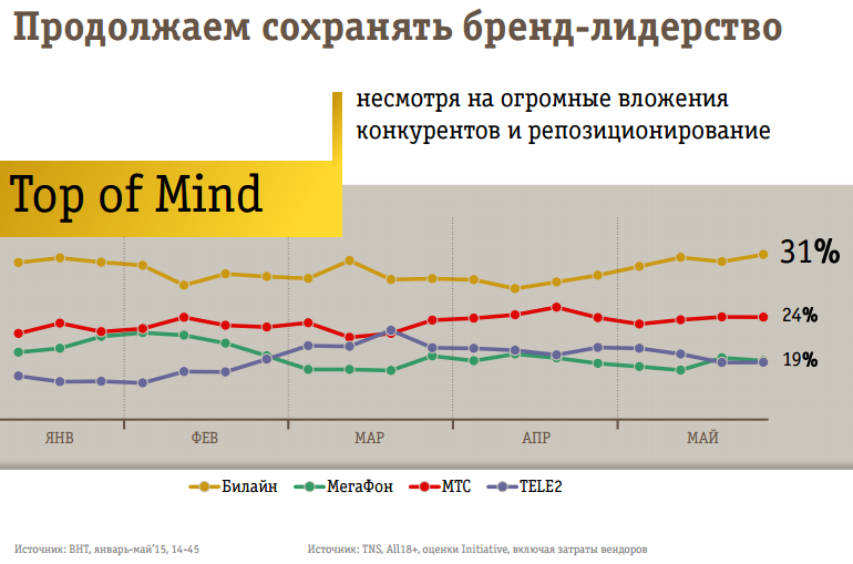 Эффективно работает наша система маркетинговых коммуникаций. Согласно нашим исследованиям, мы продолжаем сохранять лидерство по такому показателю, как Top of Mind. Это особенно важно, поскольку в 2q2015 оба конкурента существенно увеличили инвестиции в рекламу, но какого-то значимого эффекта по нашим замерам пока что не дают. Мы продолжаем на это сдержанно реагировать, делаем больший упор на новые виды рекламы, прежде всего на рекламу в сети интернет, не наращивая вложений, скажем, в наружную рекламу и в ТВ, поскольку на наш взгляд это сейчас является не самым рациональным расходованием средств компании.