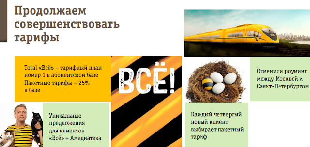 Пакетные тарифы по-прежнему являются локомотивом всего нашего бизнеса, главным фокусом нашей коммерческой политики в продажах и в маркетинге. По итогам 2q2015 можно с уверенностью говорить о том, что тарифы семейства ВСЁ! - это уже "номер 1" в нашей абонентской базе, почти 11 млн абонентов обслуживается на этих тарифах.