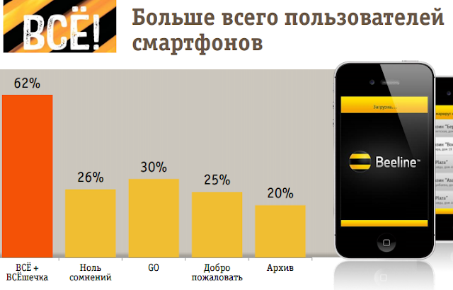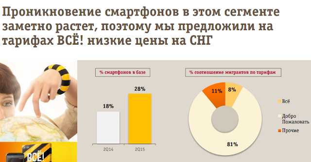 Что приятно, мигрантский сегмент тоже "взрослеет", там растет проникновение смартфонов. Отвечая на этот тренд, мы и в наших пакетных тарифах линейки ВСЁ! сделали льготные расценки по направлениям СНГ, что привело к снижению оттока в этом сегменте, а также к другим позитивным сдвигам, которые дают тарифы ВСЁ!
