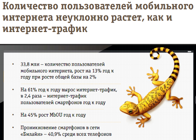 В сегменте "больших экранов", где практически 100% выручки - это выручка от пользования мобильным интернетом, модемов.  Но мы считаем этот сегмент финансово неэффективным и сознательно удерживаем там стагнацию, по крайней мере в технологии 3G.