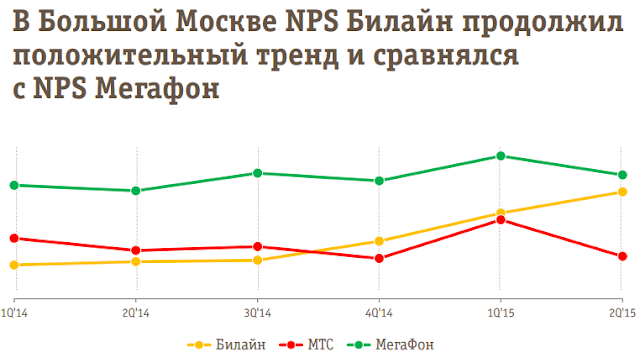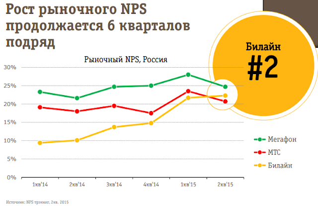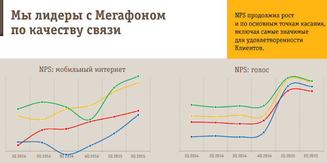 Основной критерий удовлетворенности клиентов - это NPS. Уже 6-й квартал подряд мы растем по NPS. В 2q2015 произошло знаменательное событие, мы вышли на 2-е место в "большой тройке" по NPS. По нашим данным, естественно. (Прим АБ: ВымпелКом не раскрывает методику замеров и вычислений показателя NPS). Прогресс, безусловно заметен. Это оказывает позитивное воздействие и на финансовые показатели, и на размер клиентской базы.