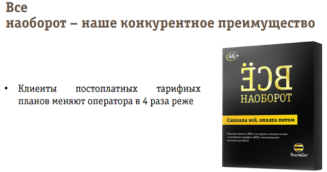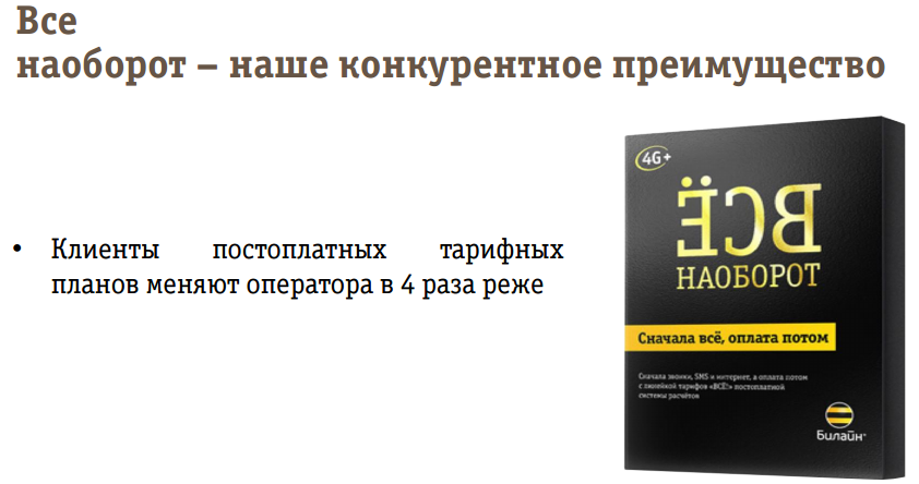 Понятно, что постоплата дает клиенту много преимуществ. Также эти преимущества оборачиваются серьезными плюсами для оператора. В частности, существенно ниже отток, примерно в 4 раза меньше, чем в предоплатных тарифах.  Существенно выше ARPU постпейд абонентов, в том числе ARPU по всяческим дополнительным услугам и по мобильному интернету.