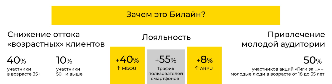 ИЛ: Важно отметить, что нам не интересно растить MboU и ARPU любой ценой, мы не хотим формировать guilty pleasures у пользователей. Мы хотим партнерских, взаимоуважительных отношений клиента с компанией. Постулируя какие-то "вечные ценности", то, что клиент может жить ярким, интересным образом жизни, что помогает чувствовать себя хорошо и счастливо, мы надеемся, что аудитория ответит нам взаимностью. И ожидаем, что у акций "Гиги за..." будет уже не 1 млн клиентов, а, скажем, 5 млн.