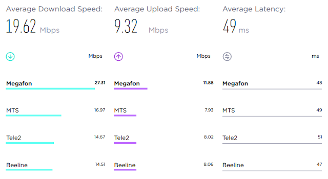 Результаты по Ookla вполне неплохие, но заметно отличаются от результатов, которые показывает сеть МегаФон более скромными значениями (крупные цифры - усредненные данные по России):