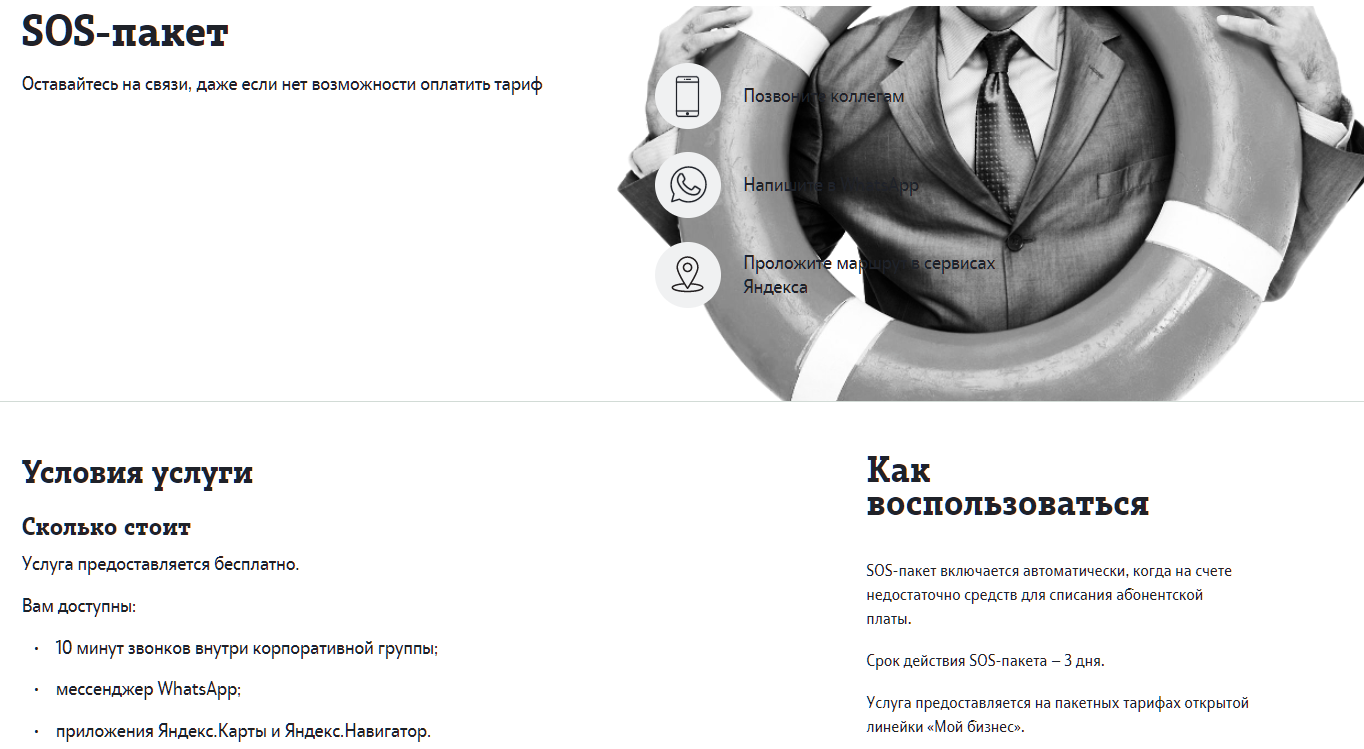 В обновленных тарифах появился так называемый SOS-пакет, обещана возможность оставаться на связи, когда на счете не осталось средств для списания абонентской платы. На деле это 10 минут звонков внутри корпоративной группы, сохранение работоспособности мессенджера WhatsApp, приложений Яндекс.Карты и Яндекс.Навигатор. Пакет включается автоматически, если на счете недостаточно средств для списания абонплаты. Действует пакет - 3 дня. Услуга предоставляется на пакетных тарифах открытой линейки "Мой бизнес".