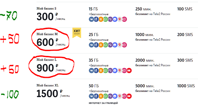 А что же теперь? Проведена, как это принято говорить, коррекция тарифов. Смотрите, есть даже понижения - на самом бюджетном (но не самом популярном) и на самом дорогом (тем более не самом популярном тарифе). А вот на востребованном Мой бизнес М - полтинник накинули, ну, подумаешь. Наверняка абоненты будут не против. Тем более, если говорить про абонентов Мой бизнес L. Абонентам полтинник в месяц, пустяк, не обеднеют, а компании какой-никакой, а прибыток.