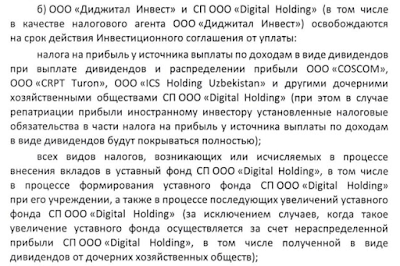 Правительство Узбекистана через Агентство по управлению государственными активами (АУГА) передаст в собственность СП долю в размере 100% уставного капитала телеком-оператора Ucell. Российская сторона внесет в Digital Holding $100 млн инвестиций в развитие, а также дочерние предприятия USM – CRPT Turon и ICS Holding Uzbekistan.