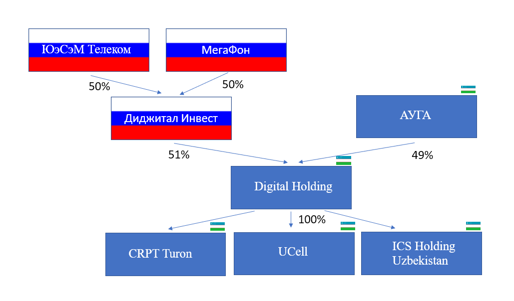 Агентство по управлению госактивами (АУГА), представляющее правительство Узбекистана, передаст в собственность создаваемому СП Digital Holding долю в размере 100% уставного капитала телеком-оператора Ucell. Российская сторона вложит $100 млн, а также передаст доли предприятий USM: CRPT Turon и ICS Holdings Uzbekistan.