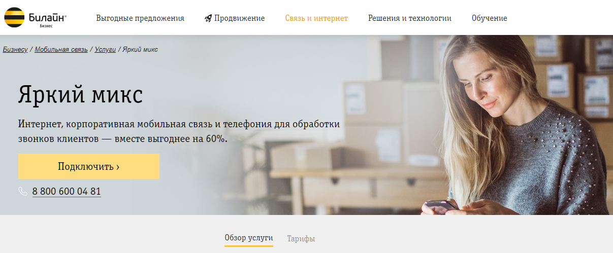 Подключиться можно на сайте Билайн Бизнес. Цены на картинке указаны для Москвы, в Санкт-Петербурге "Яркий микс М" обойдется в 2500 руб (с НДС). Пока что предложение будет действовать в 61 регионе страны.