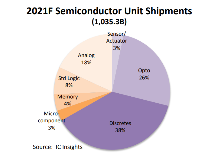 Согласно прогнозам, в 2021 году в общем объеме поставок полупроводников в штуках будут по-прежнему доминировать оптоэлектронные, сенсорные и дискретные устройства. На них придется 67% от общего числа поставленных полупроводников, на долю микросхем - 33%. Если разбивать O-S-D по категориям, то 38% придется на дискрет, 26% - на изделия оптоэлектроники, 18% - на аналоговые ИС. Быстрее других категорий в 2021 году будут расти те, что требуются при производстве сетевых и облачных вычислительных систем, бесконтактных систем, автомобильной электроники, а также системы и устройства экосистемы 5G.