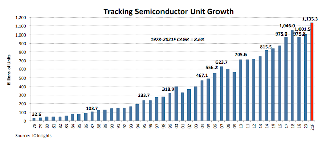 Прогнозируемый рост на 13% до 1,1353 трлн последует за ростом на 3% в 2020 году. Результаты 2020 года вряд ли были бы столь скромными, если бы не определенная доля хаоса, которую внесла так называемая пандемия, точнее меры по борьбе с ней. С 1978 года, когда было отгружено 32,6 млрд полупроводниковых устройств и вплоть до 2021 года, усредненные темы среднегодового роста (CAGR) объемов отгрузки в сегменте производства полупроводников составляли 8.6%, - впечатляющие 43 года роста! То, что рост не останавливается, это свидетельство в пользу того, что как бы не менялся рынок, какие бы новые технологии на нем не появлялись, всем по прежнему нужны полупроводники и во все больших объемах.