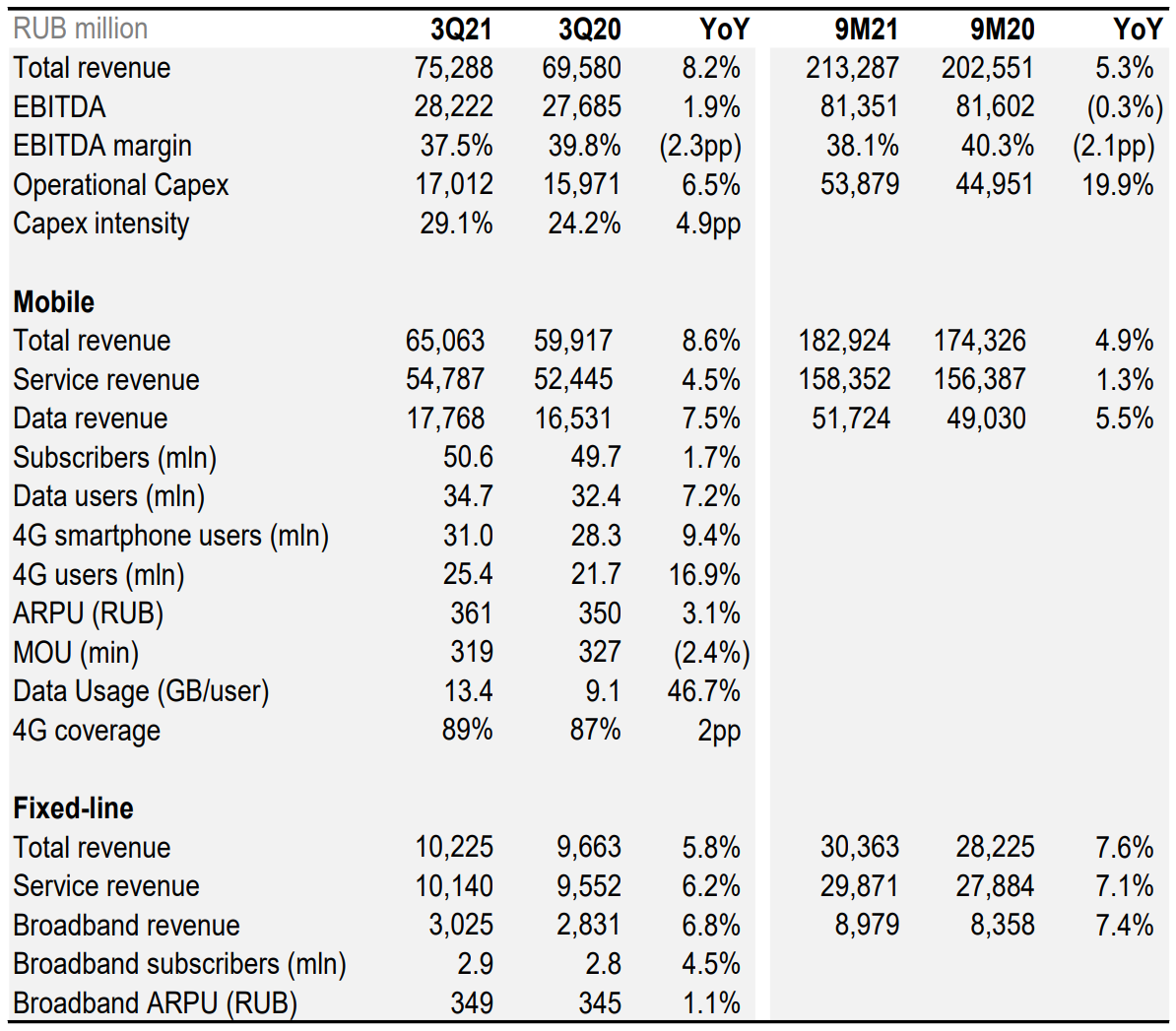 Компания развивает цифровые сервисы, растет пользование цифровым ТВ, в частности в 3q2021 MAU билайн ТВ добралось до 3,1 млн (+16,7% гг). Хорошо себя показывает перспективное направление онлайн-продаж, в том числе продажа продуктов с самостоятельной регистрацией. Выросло количество ежемесячных пользователей приложения билайн - на 13,9% гг.