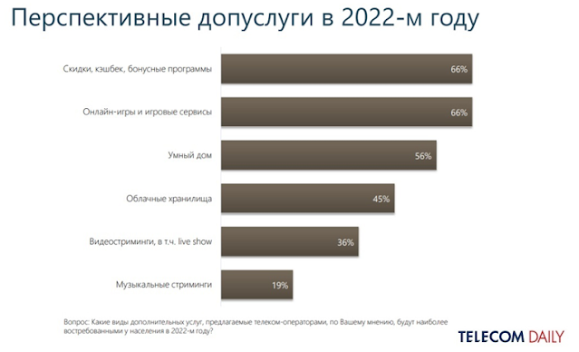 На вопрос, какие опции/сервисы станут наиболее востребованными в следующем году, представители операторов ответили определенно — скидки, кэшбэк и бонусные программы, а также онлайн-игры и игровые сервисы. Оба эти варианта набрали по 66% голосов. «Умный дом» выбрали 56%, облачные хранилища — 45%.