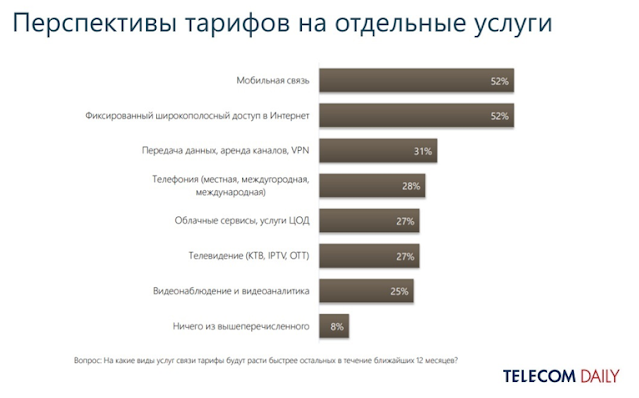Больше всего вырастет стоимость самых востребованных услуг, мобильной связи (в рамках FMC, IoT-продукта, видеонаблюдения и т.п.) и фиксированного доступа в интернет — эти варианты выбрали 52% опрошенных. Услуги для бизнеса (аренда каналов, VPN и т.д.) подорожает по мнению 31%, телефония — 28%, телевидение — 27%, облачные сервисы и ЦОДы — те же 27%.