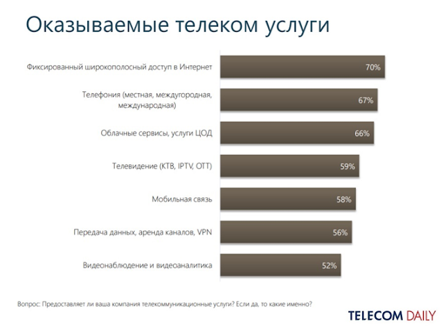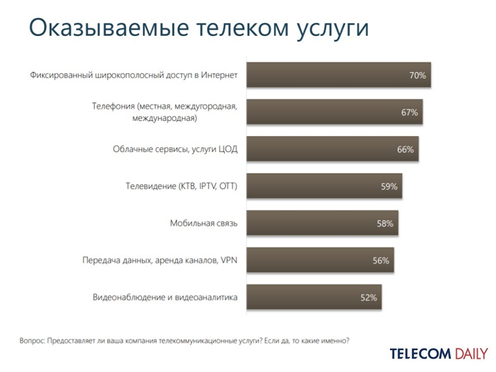 Среди них 70% оказывают услуги фиксированного ШПД, телефонии – 67%, осуществляют доступ к облакам и ЦОДам – 66%, ТВ – 59%, мобильная связь — 58%, аренда каналов и VPN — 56%, видеонаблюдение и видеоаналитика — 52%.