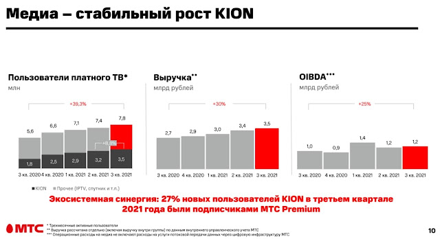 Как я уже отмечал выше, наблюдается стабильный рост абонбазы услуг платного ТВ, включая KION и IPTV. Растет абонбаза, растет выручка. С OIBDA не так стабильно, поэтому что из всего этого получится пока что по пословице "бабушка гадала, да надвое сказала: то ли дождь, то ли снег; то ли будет, то ли нет".